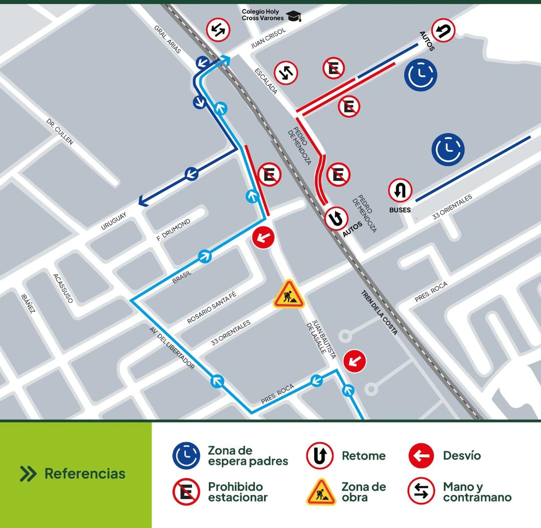 Para cruzar las vías en sentido hacia Panamericana, los autos deberán utilizar un recorrido alternativo por la calle Escalada, cuyo sentido fue modificado provisoriamente para que sea doble mano buscando facilitar el flujo vehicular. La calle Crisol también funciona provisoriamente en doble sentido, facilitando el acceso al Colegio Holy Cross. Los accesos al colegio podrán realizarse por Brasil o Uruguay, continuando por Arias, Crisol, Escalada y Pedro de Mendoza.Habrá agentes de tránsito presentes para asistir y garantizar el cruce seguro de los alumnos.