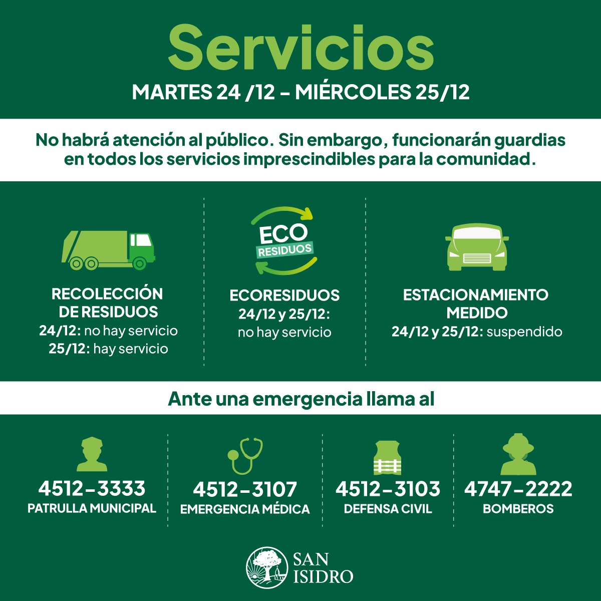 La Municipalidad de San Isidro informa el funcionamiento especial de los servicios durante las fechas de Navidad.