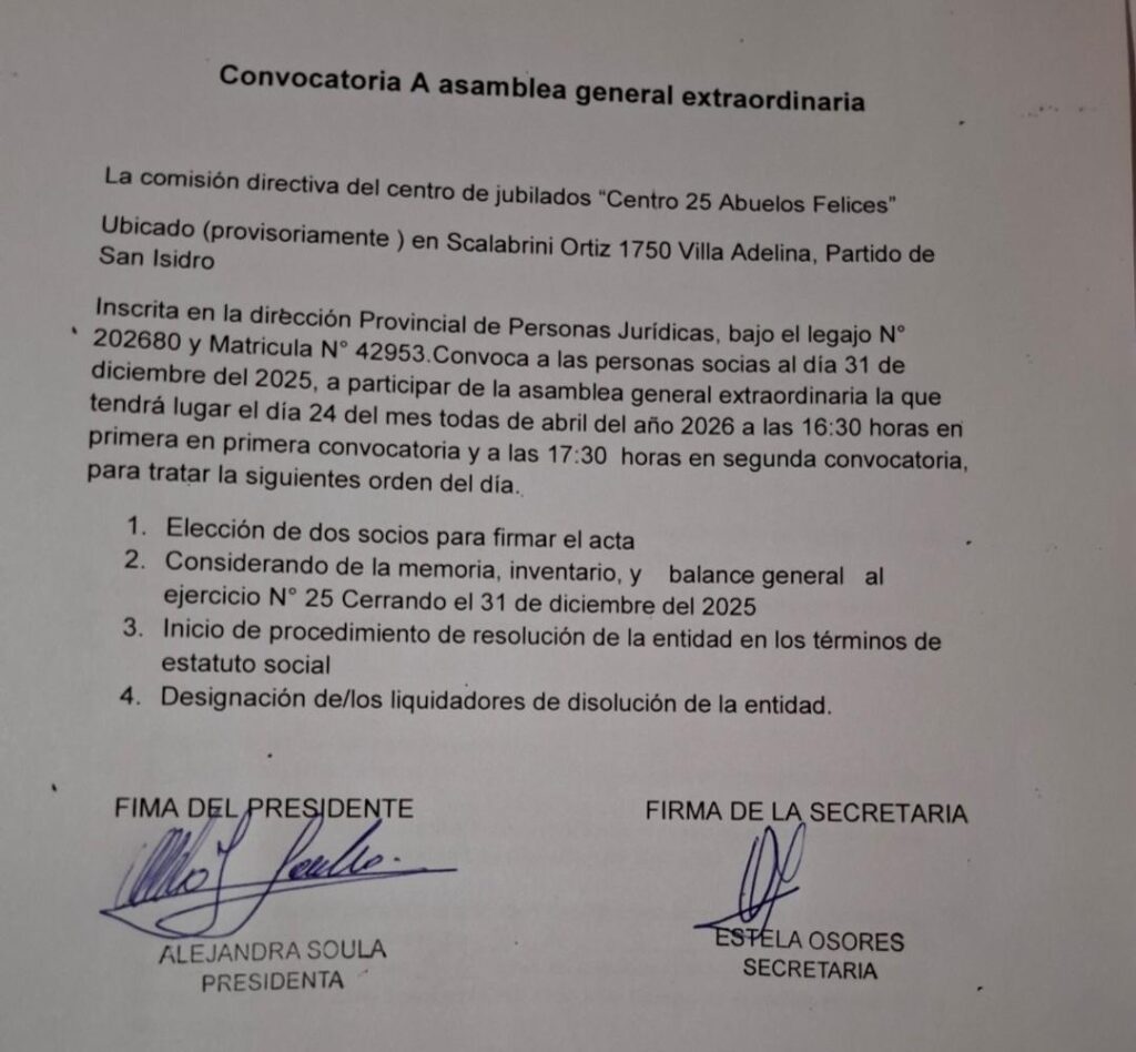 Inscrita en la dirección Provincial de Personas Jurídicas, bajo el legajo N°202680 y Matrícula N° 42953. Convoca a las personas socias al 31 de diciembre del 2025, a participar de la asamblea general extraordinaria la que tendrá lugar el día 24 del mes de abril del año 2026 a las 16:30 horas en primera convocatoria y a las 17:30 horas en segunda convocatoria, para tratar las siguiente orden del día.
