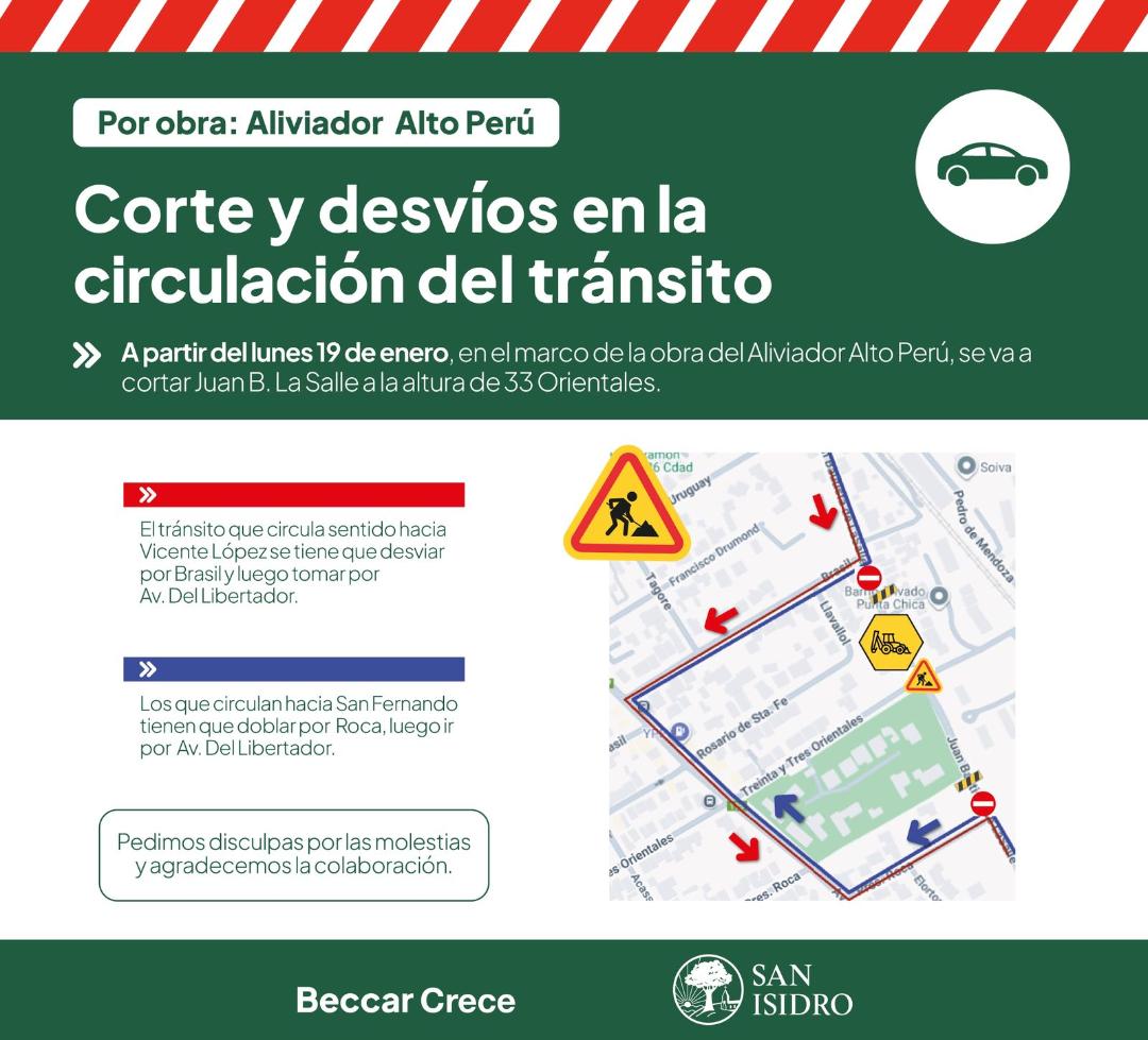 En el marco de la obra del Aliviador Alto Perú, está avanzando el empalme de conductos subterráneos para su posterior conexión con el río en la zona de La Salle y Treinta y Tres Orientales. Los trabajos, que llevarán alrededor de 40 días, suponen un corte y desvío de tránsito entre las calles Brasil y Presidente Roca, y se realizan en los meses de verano aprovechando que la circulación de vehículos es menor. Se trata de tareas claves para la finalización del túnel que beneficiará a los vecinos de Beccar.