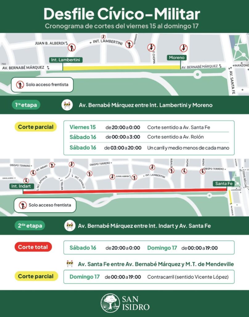Por el evento se realizarán cortes de tránsito (VER MAPA). Habrá dos etapas de cortes: los parciales serán el viernes 15, de 20:00 a 00:00 en la avenida Márquez entre Int. Lambertini y Moreno, en sentido a Av. Santa Fe. Luego, el sábado 16 de 00:00 a 3:00, en Márquez en sentido a Av. Rolón; y de 3:00 a 20:00 se cortará el tránsito en un carril y medio de cada mano.