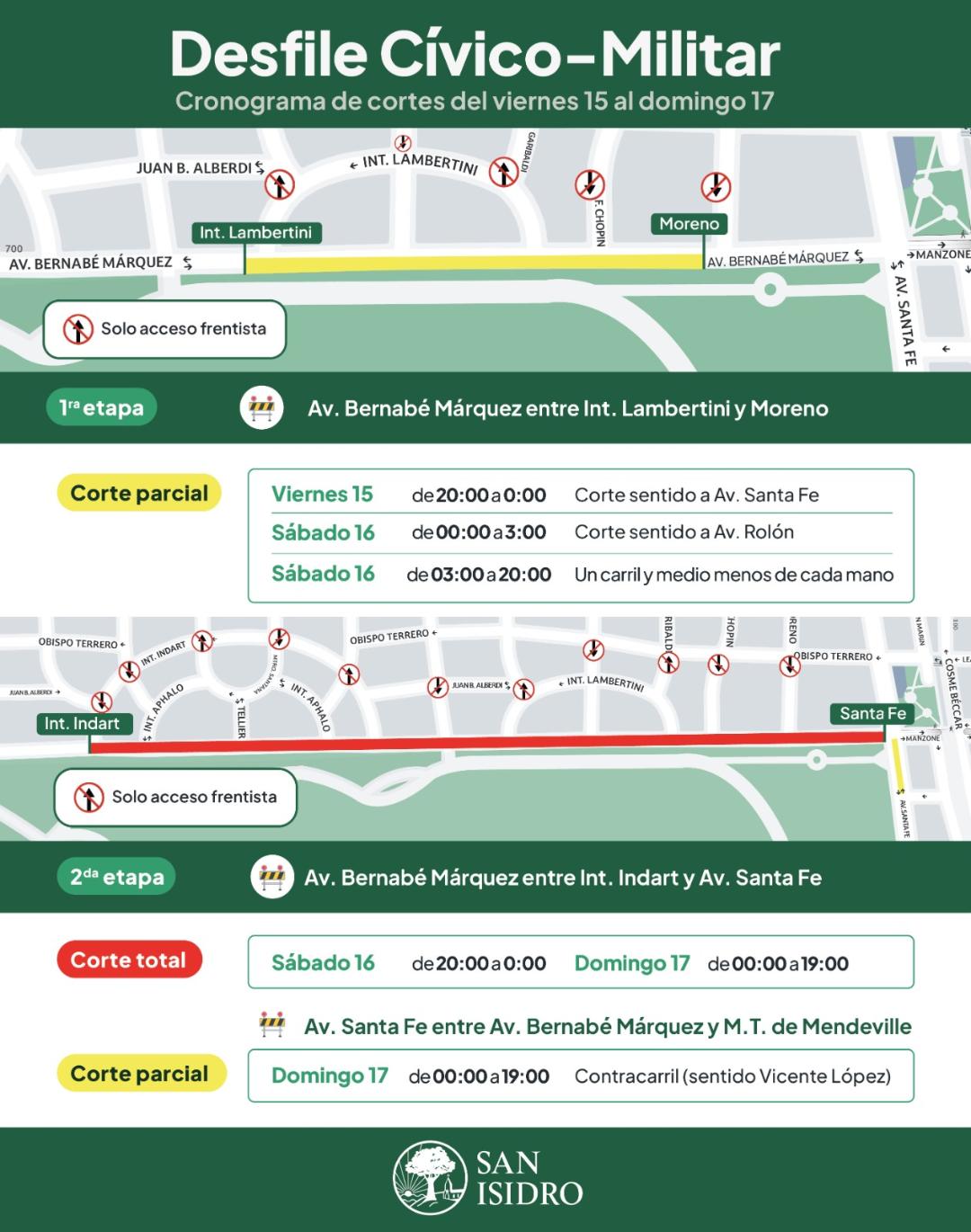 Mientras que, en la segunda etapa, el sábado 16, de 20:00 a 00:00 se realizará un corte total en Márquez entre Int. Indart y Av. Santa Fe. Y el domingo de 00:00 a 19:00.