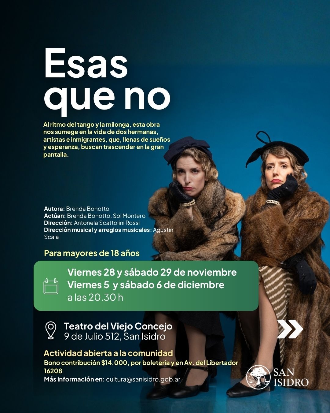 Esas que no tendrá cuatro funciones: el viernes 28 y el sábado 29 de noviembre, y el viernes 5 y sábado 6 de diciembre, a las 20.30 hs. Con dirección de Antonela Scattolini Rossi y actuación de Sol Montero y Brenda Bonotto (también autora de la obra), la pieza es un vaudeville y sainete al ritmo del tango y la milonga que sumerge en la historia de dos hermanas, artistas e inmigrantes, que llenas de sueños y esperanza buscan dar sentido a su existencia y trascender en la gran pantalla. Una historia de amor y transformación frente al abismo que se abre ante las dificultades, el dolor de las pérdidas y las frustraciones. Para mayores de 18 años.