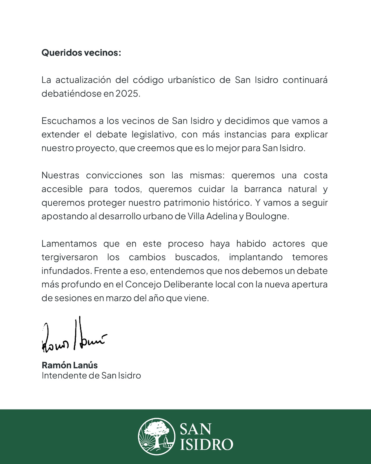 “Escuchamos a los vecinos de San Isidro y decidimos que vamos a extender el debate legislativo, con más instancias para explicar nuestro proyecto, que creemos que es lo mejor para San Isidro”, afirma el intendente local en la carta.