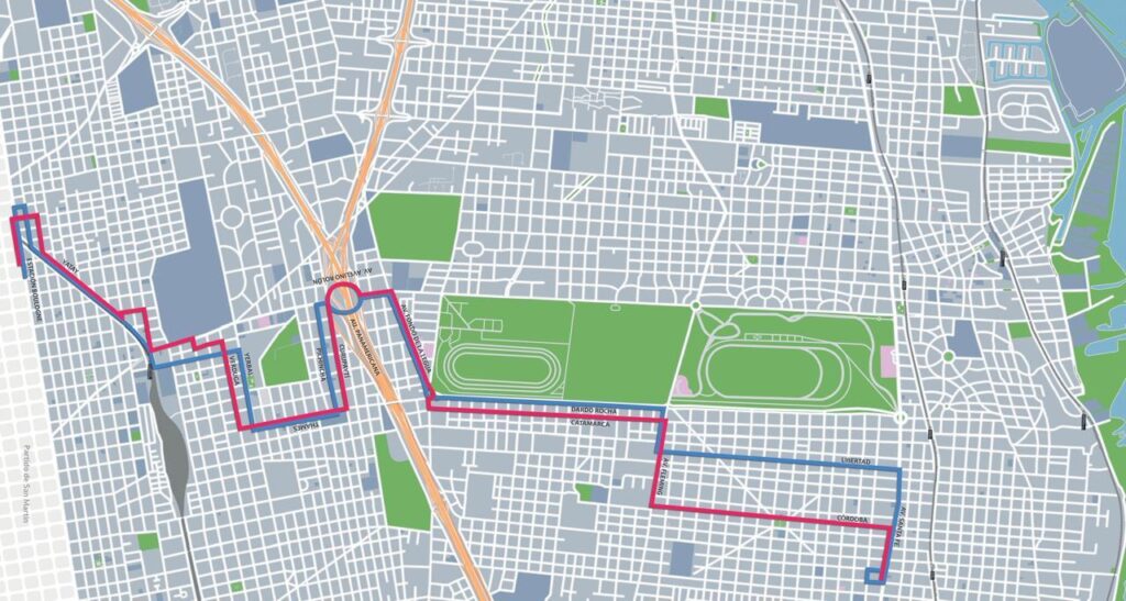 VUELTA: Av. Santa Fé y Gral. Alvear – Córdoba – Av. Sir Alexander Fleming – Catamarca – Av. Fondo de la Legua – Av. Avelino Rolón – Curupaytí – Thames – José María Verduga – Salguero – Independencia – Av. Avelino Rolón – José Figueroa Alcorta – Malabia – Bernardo de Irigoyen – Yatay – Bacacay – Manuel Láinez – Sarratea – Matheu – Andrés Lamas hasta cabecera donde termina el recorrido.