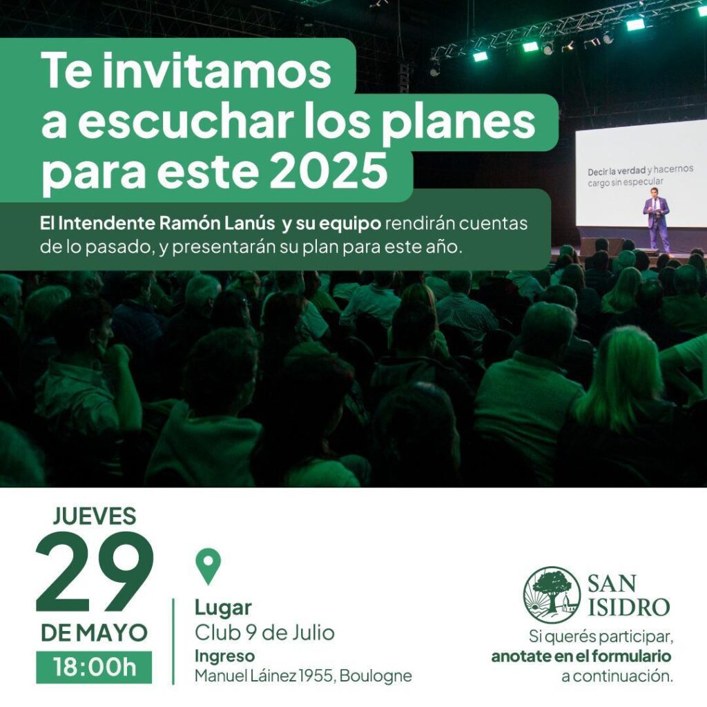 El intendente de San Isidro, Ramón Lanús, se reunirá con vecinos de Boulogne este jueves 29 de mayo, a las 18 hs, en la Sociedad de Fomento 9 de Julio (Láinez 1955) para contar todo lo que hicieron hasta ahora y, sobre todo, adelantar los planes que tienen para la ciudad en particular y el distrito en general.