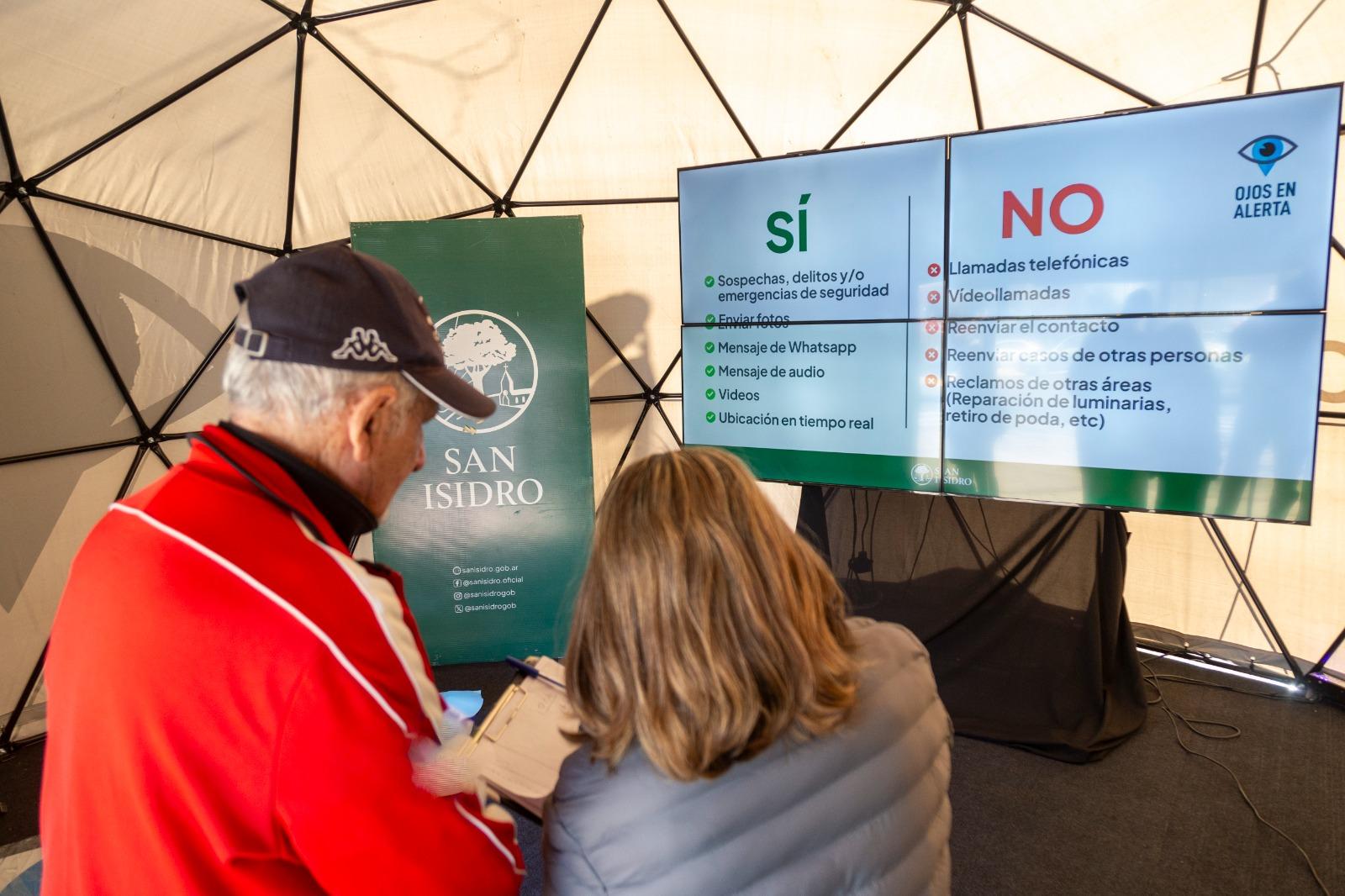 Con el objetivo de que los vecinos se puedan capacitar rápidamente para sumarse al programa de seguridad Ojos en Alerta, el Municipio de San Isidro instaló un domo con una pantalla gigante en la plaza Hipólito Yrigoyen, ubicada en la avenida Centenario 77.