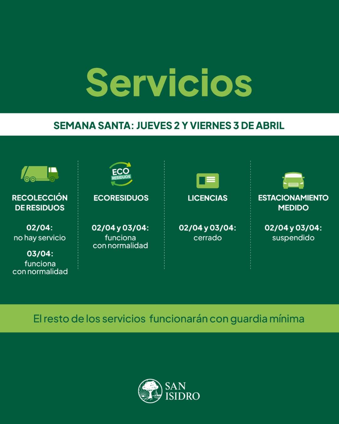 Por los feriados del jueves 2 y viernes 3 de abril, la Municipalidad de San Isidro no atenderá al público, pero funcionarán guardias en todos los servicios imprescindibles para la comunidad.